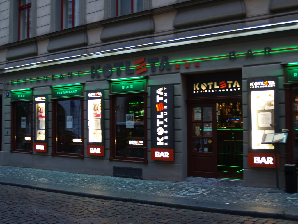 Un autre endroit intéressant, mais à l’opposé du Tri Stoleti pour ce qui est du bruit, il s’agit du resto-bar Kotleta sur la rue Truhlarska. Chaises et tables hautes, écrans géants diffusant des matchs sportifs, musique dynamique. Le service est impeccable et la nourriture, excellente. Je dirais même que les portions sont énormes, mais les hommes doivent y trouver leur compte, j’imagine. En tout cas, le mien, il a bien aimé les 8 saucisses servies avec 4 tranches de pain, choucroute et 2 sauces qu’il a commandées en entrée et la côte de porc de 2 pouces de hauteur en plat principal. La pivo (bière locale) est servie dans des bocks gigantesques à moins de 2 $. J’ai bien aimé ma soupe au goulash en entrée et mes schnitzels au poulet frit, ainsi que le strudel aux pommes chaud servi au dessert.