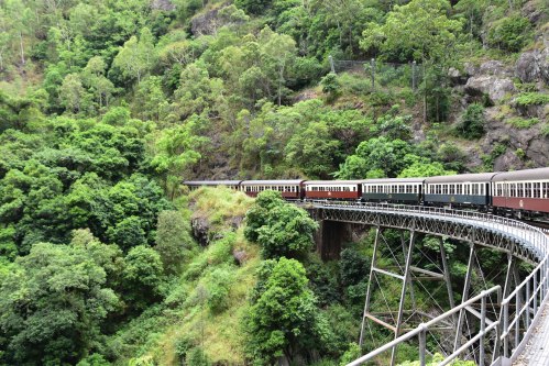 Notre tour guidé nous amène maintenant au Skyrail Rainforest Cableway, un petit train vieux de près d’un siècle qui sillonne les montagnes de la forêt tropicale menant au village de Kuranda, où habite depuis 10 000 ans le peuple aborigène Djabugay.