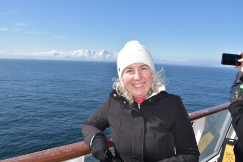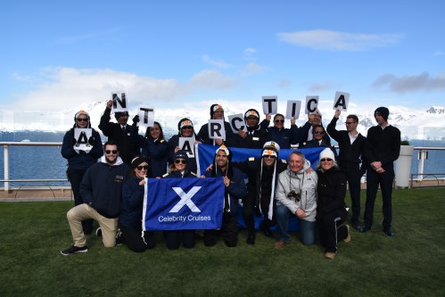 Mon conjoint et moi, à l’avant à droite, prenant la pause avec le personnel d’animation sur le pont du navire. Soleil, sourires, paysages fabuleux sous un beau 4 degrés Celsius.