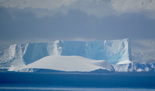 On peut distinguer la trace des manchots qui ont glissé sur la bute de neige, à gauche de l’iceberg.