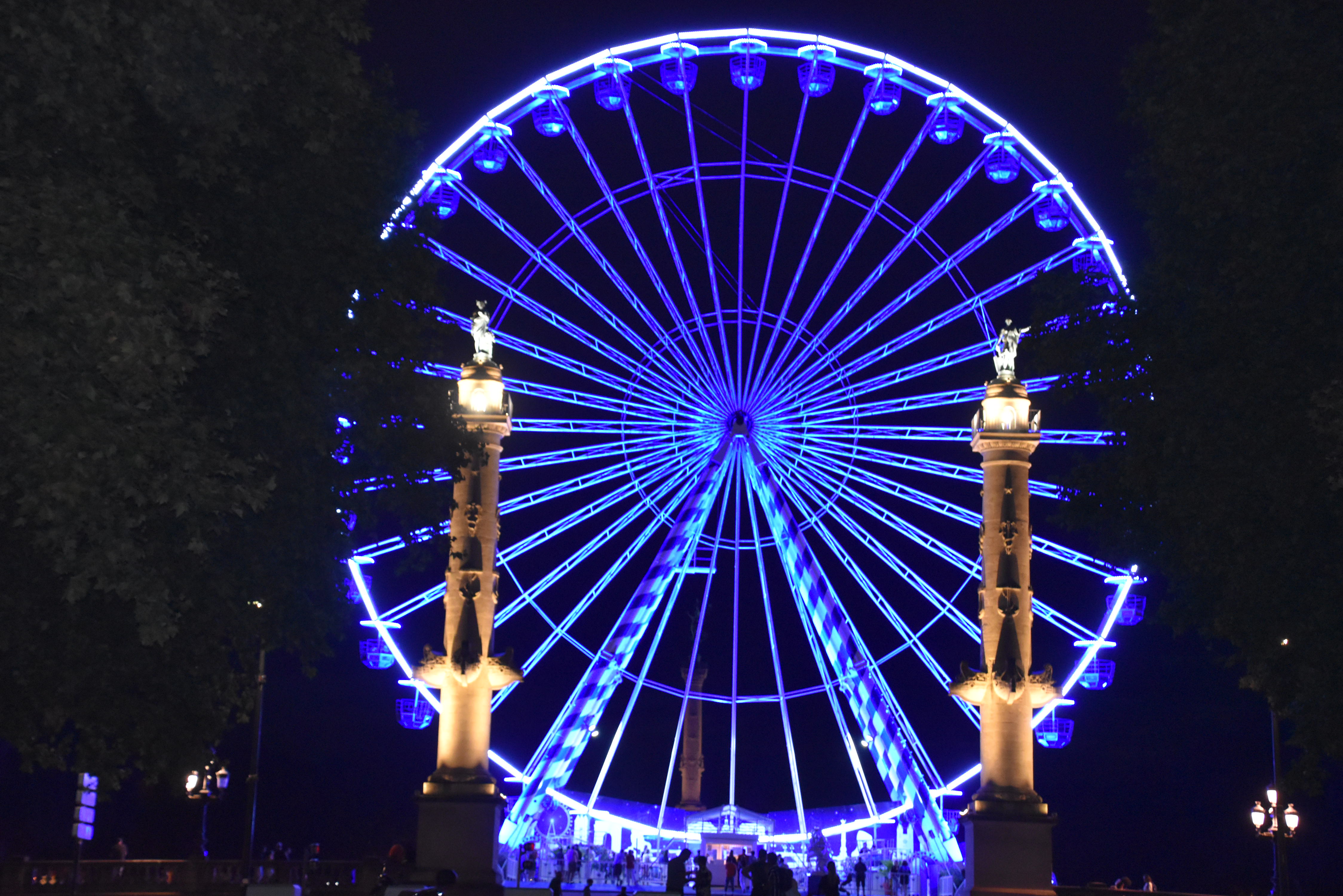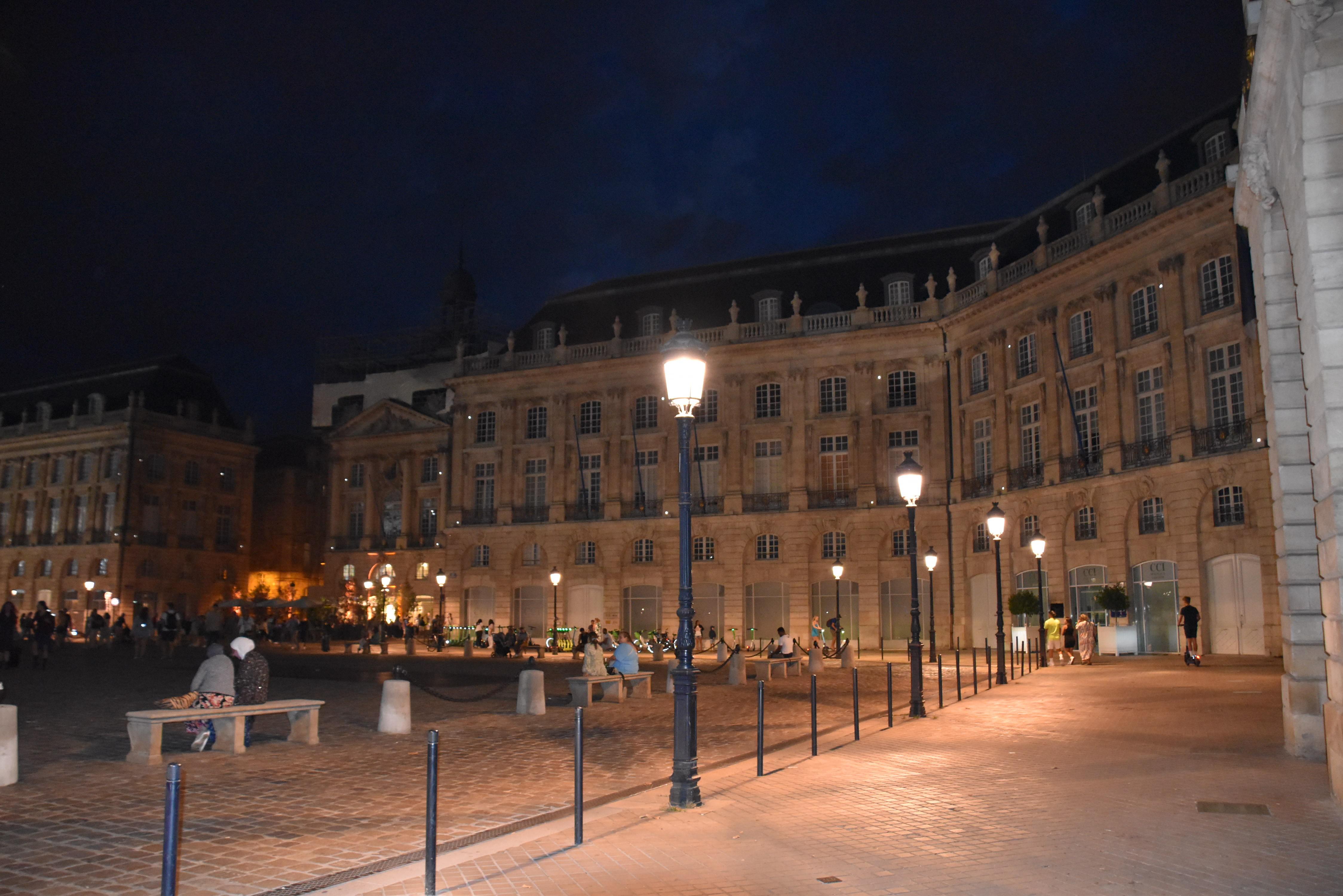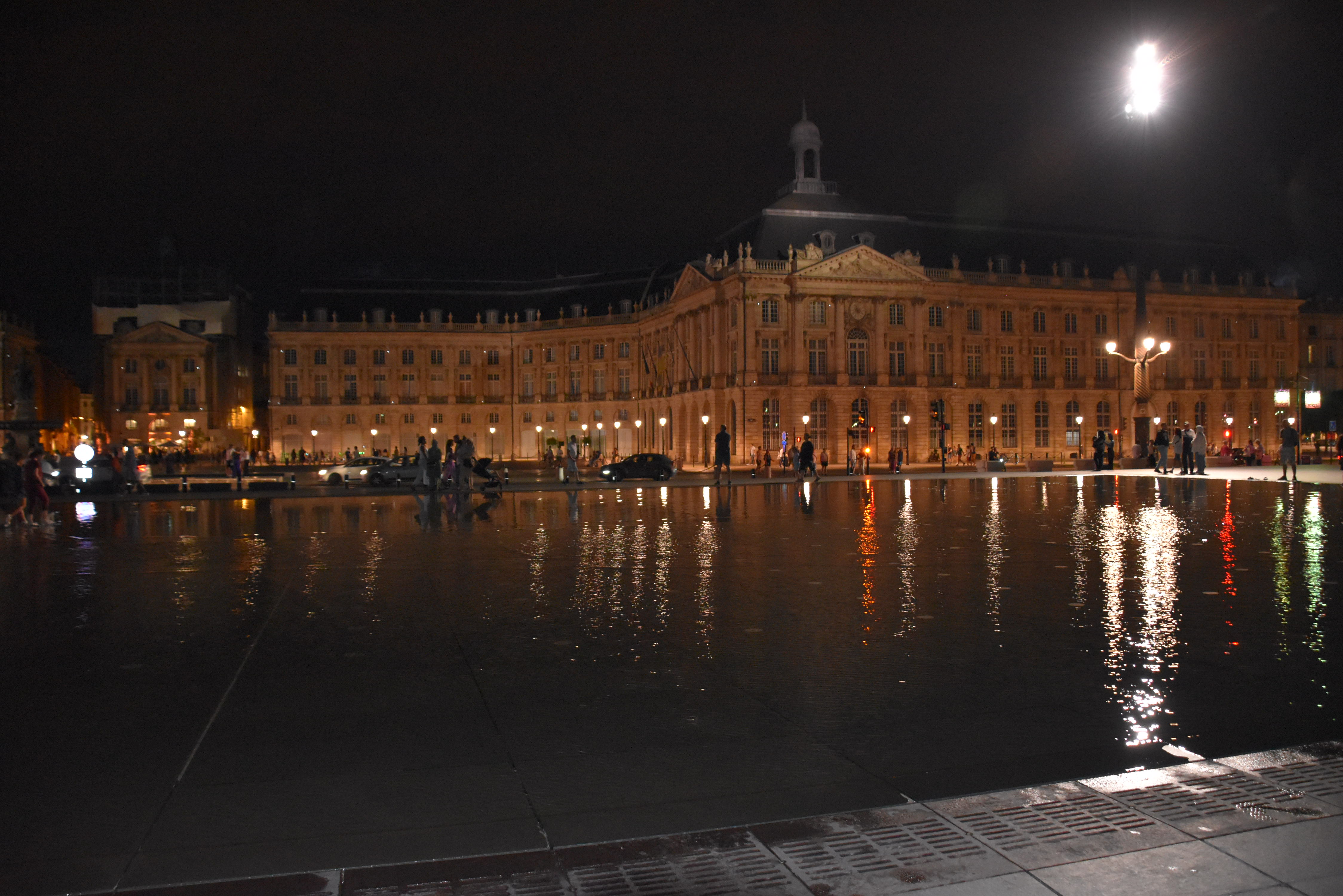 Le vin était bon, mais nous y reviendrons. Notre première journée à Bordeaux se termine par une visite à pied des environs du port, le soir. Il faut voir la Place de la Bourse et le miroir d’eau. Deux centimètres d’eau recouvrent une dalle de granit, produisant un effet miroir. Le jour, petits et grands s’y promènent, pieds nus. Le soir, la grande roue est illuminée, pour le plaisir des yeux.