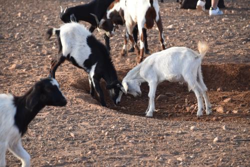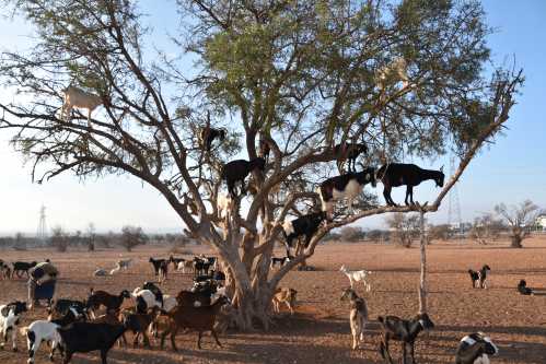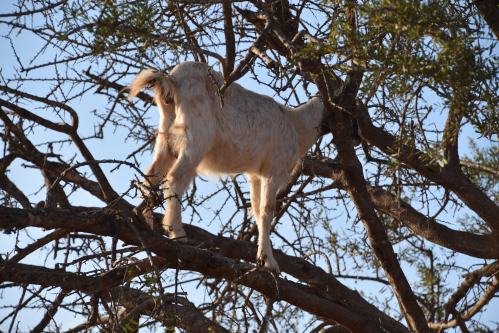 En chemin, on arrête sur le bord d’une route pour photographier des chèvres grimpées aux arganiers, ces arbres épineux produisant des noix d’argan qu’elles raffolent. Les chimistes font des produits de beauté avec l’huile d’argan, mais aussi des produits médicinaux et de l’huile à salade.