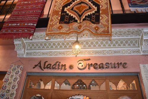 On reprend notre marche jusqu’aux trésors d’Aladin. Cette boutique vend des tapis (magiques?), des bijoux, des bibelots de terre cuite, des antiquités, des souvenirs. On ne trouve rien qui pourrait intéresser notre princesse Jasmine.