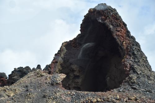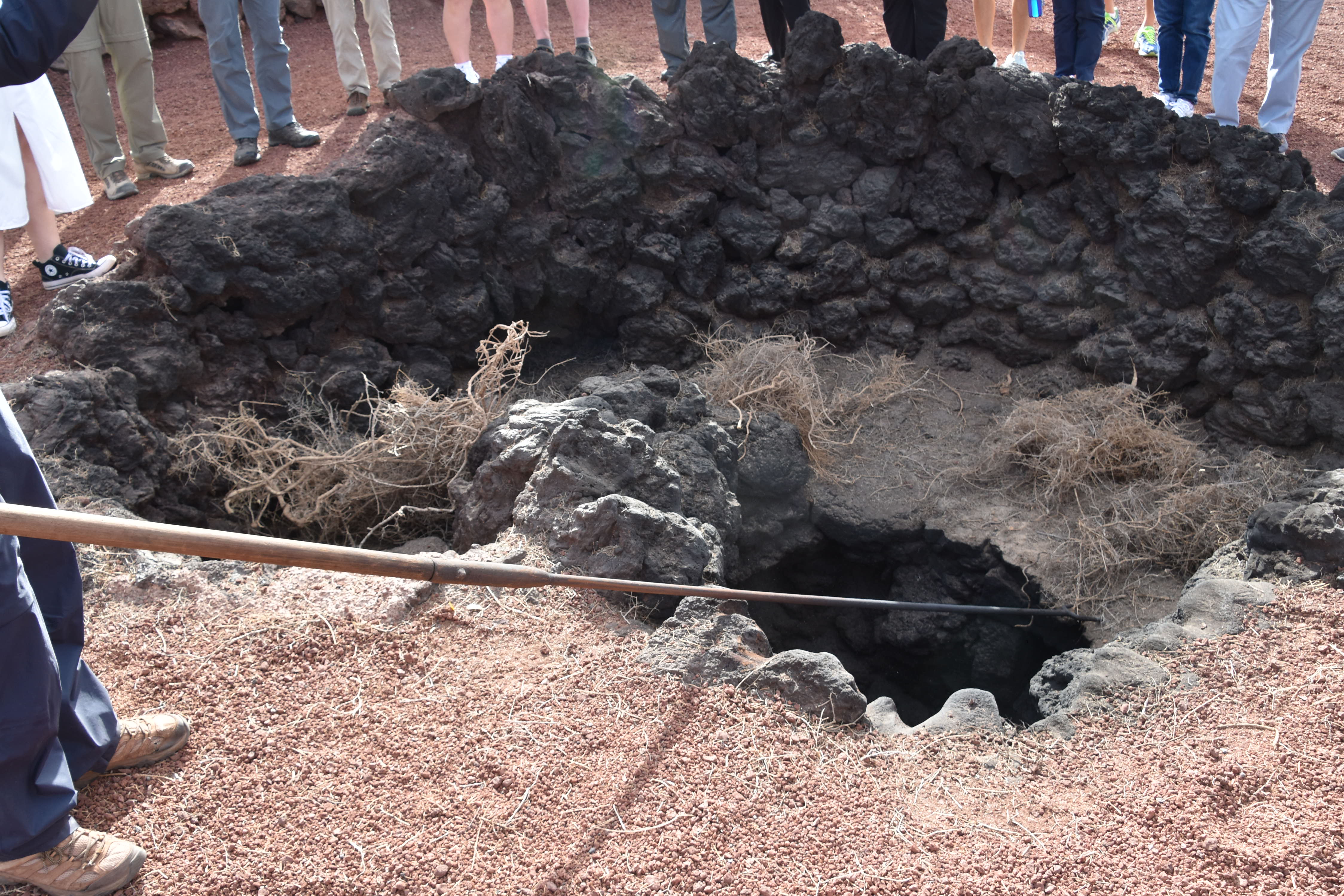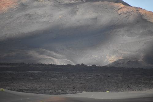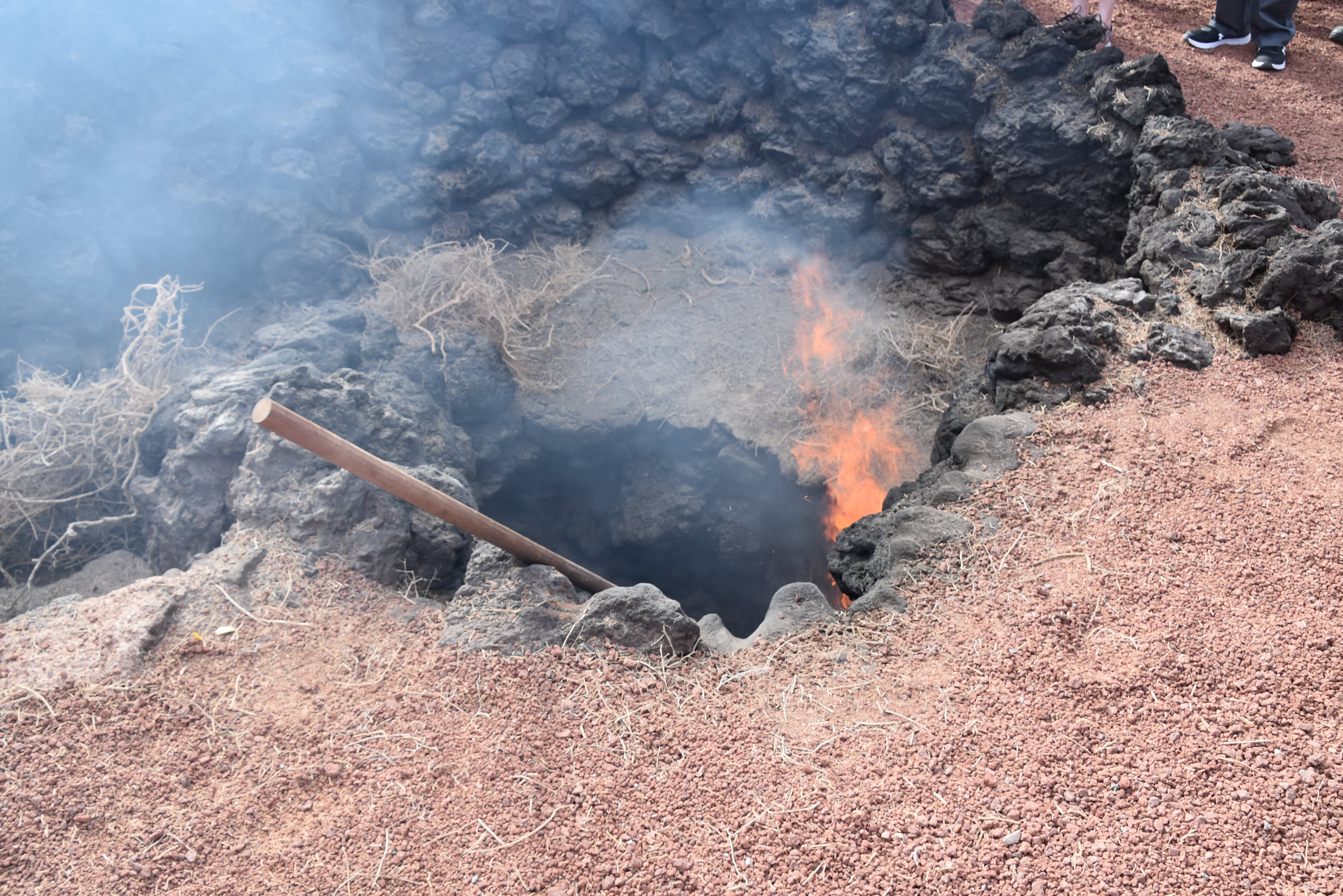La lave de la dernière éruption du cratère Timanfaya est visible partout. Le roc est noir et rouge, signe de l’oxydation ferreuse. La roche est toujours bouillante. Les brindilles prennent feu quand on les échappe dans une crevasse du sol. Quel spectacle!