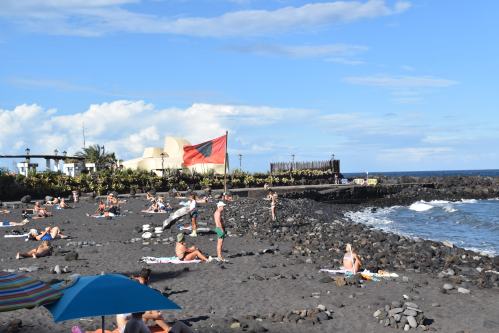 En face de ce petit havre de paix, plusieurs piscines naturelles se sont formées à même le roc lors de la dernière coulée de lave. Les gens s’y baignent habituellement, mais aujourd’hui, les vagues sont trop fortes, annonciatrices d’une tempête.