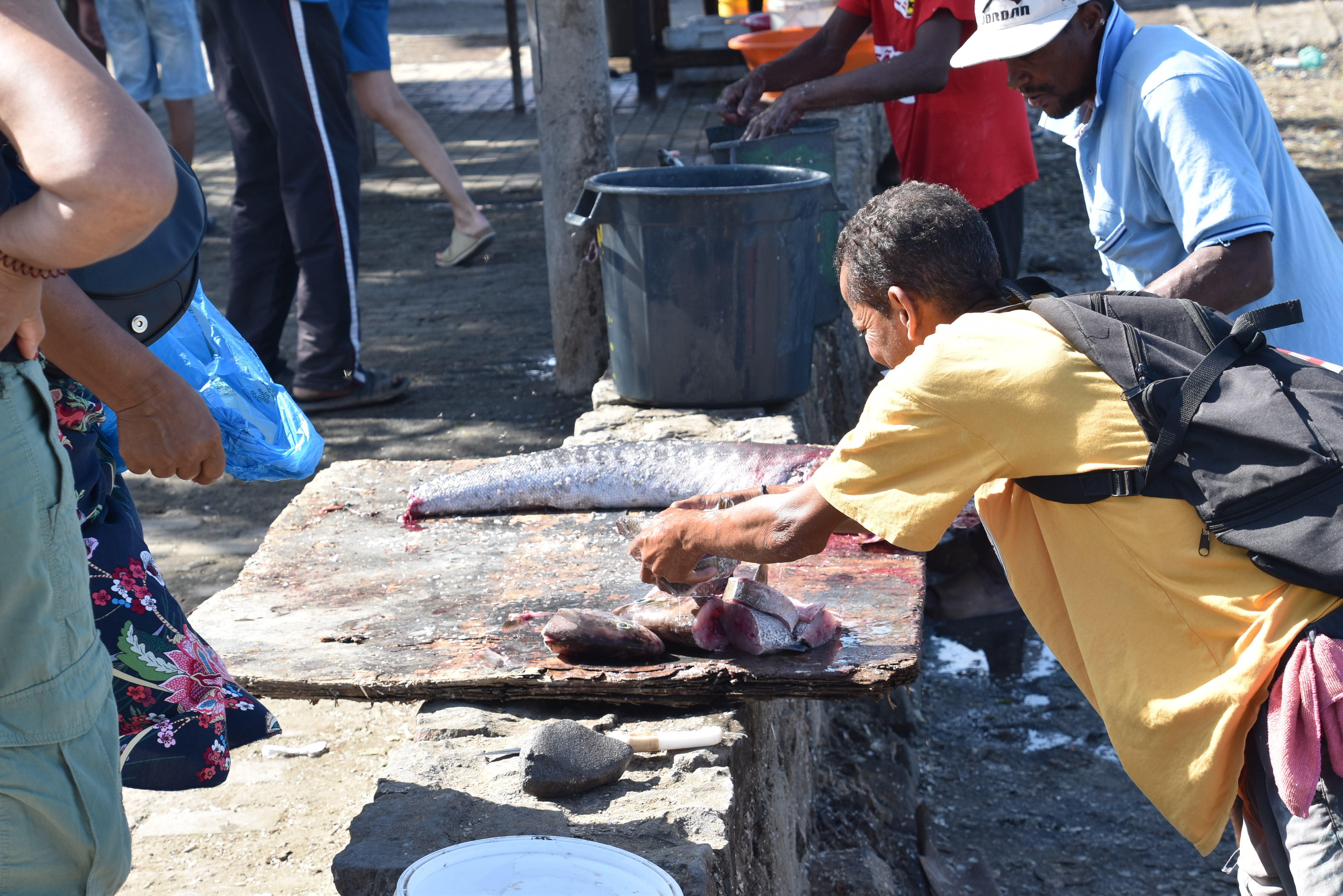 Des pêcheurs vendent leurs prises aux femmes, tandis que leurs maris discutent au bar.