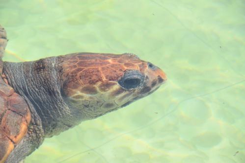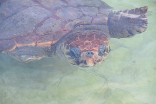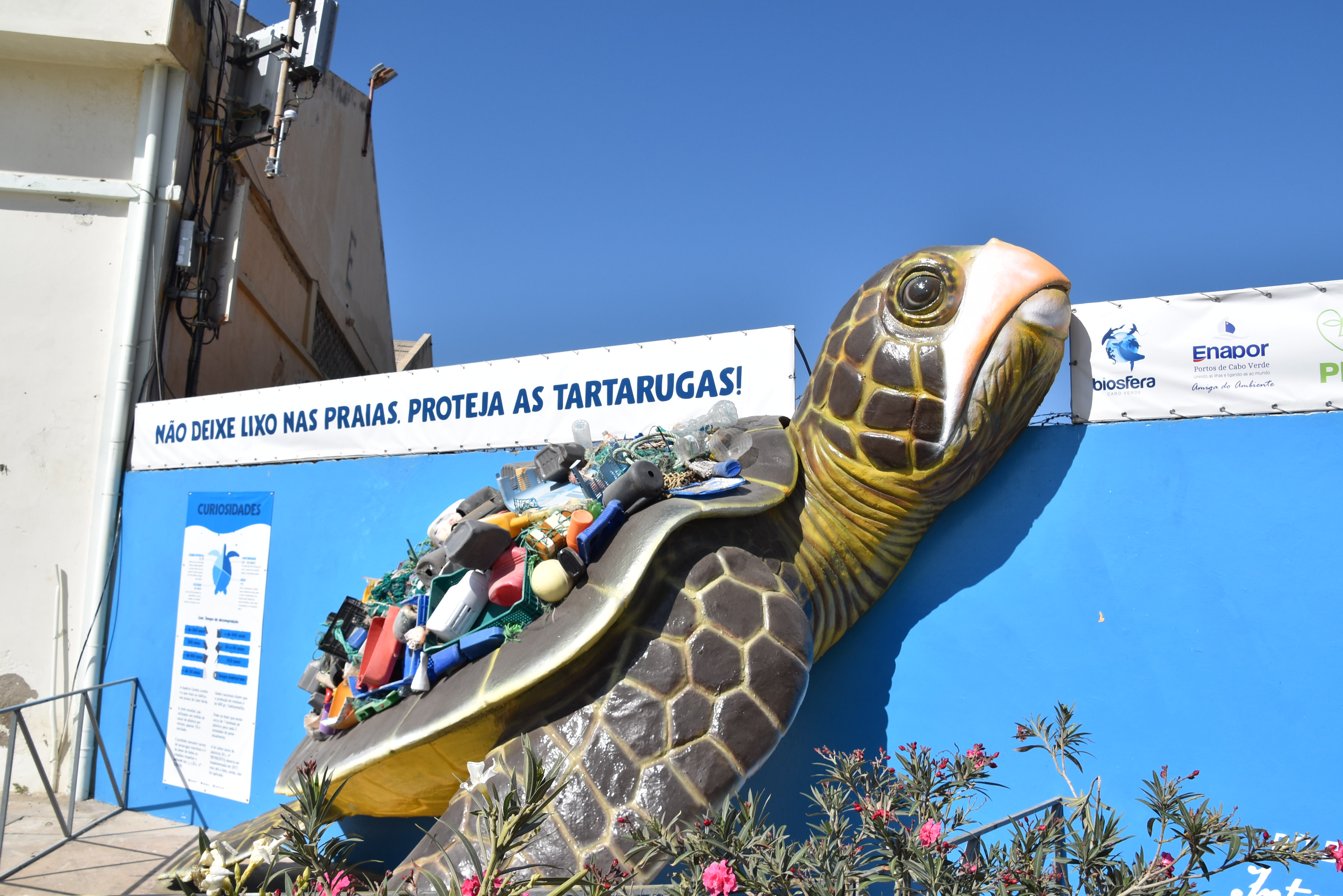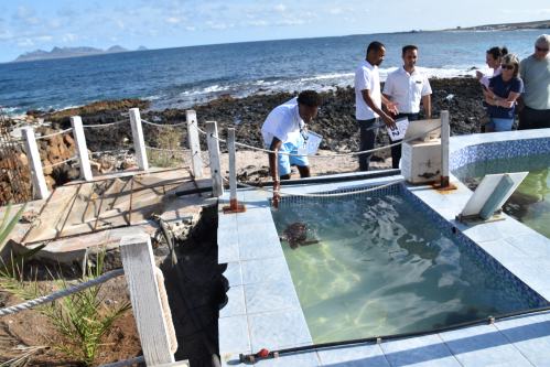 On se rend ensuite dans un refuge à tortues, situé à côté d´un des trois volcans éteints de l’île São Vicente. Les tortues sont capturées lorsqu’elles sont trouvées blessées, elles sont soignées dans des bassins, puis relâchées quand cela est possible.