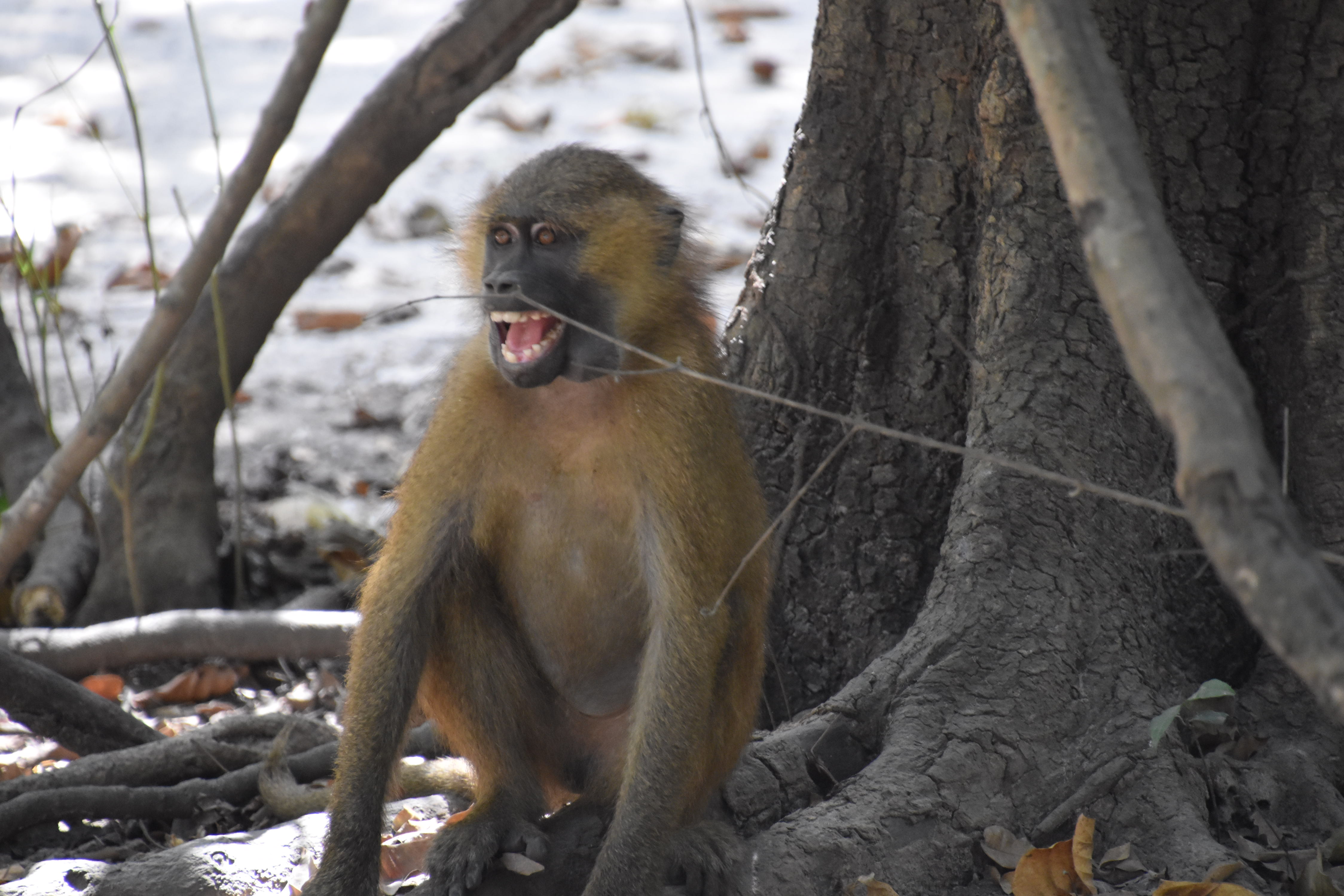 Après notre retour au camp, je déguste un bon repas typiquement gambien, fait de poulet apprêté, de poisson (aïe les arêtes!) et d’une variété de riz et de légumes cuits dans de grosses cuves de terre cuite, à l’extérieur. Ses effluves attirent les babouins, ce qui est excellent pour ma prise de photos. Un jeune babouin mâle hurle à la mort après sa sœur qui vient de lui piquer un pilon de poulet. Des souvenirs refont surface, tout à coup. L’humain ne descend-il pas des primates? Certains comportements sont semblables…
