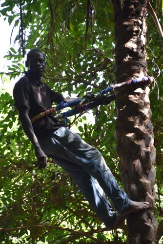 Au fil de notre promenade de deux heures en forêt, notre guide nous montre des eucalyptus, des ébéniers, des baobabs. J’assiste aussi à une démonstration d’un villageois qui grimpe, pieds nus, jusqu’au sommet d’un long palmier pour recueillir sa sève, qui nous a ensuite été servie comme apéro. Ne riez pas, cet alcool frais, sitôt récolté, est sucré et délicieux. Quelques minutes après la récolte, l’alcool devient plus fort, perd son goût sucré et fait tourner les têtes.
